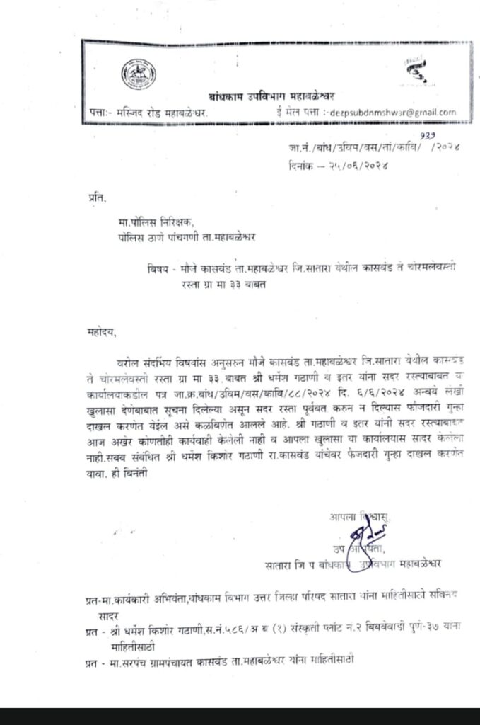 मोझे कासवंड ता महाबळेश्वर येथील कासवंड ते चोरमले वाडी रस्ता ग्रा मा 33 हा जिल्हा परिषद अंतर्गत येत असून शेजारील मिळकत ही धर्मेश गठाणी पुणे व इतर अशी मिळून खरेदी केलेली आहे परंतु बाहेरगावी राहायचे आणि महाबळेश्वर सारख्या थंड हवेच्या ठिकाणी जागा घेऊन पर्यावरण नष्ट करणे भोगोलिक वातावरण बिघडवणे आणि स्वतःचे विनापरवानगी आलिशान हॉटेल रिसॉर्ट बांधणे तिथं पार्ट्या करणे कर्णकर्कश आवाज डिजे लावणे इतर बरंच काही आयोजित करत शांतता भंग करणे आणि पुढील चार पिढ्यानसाठी प्रचंड पैसा कमविणे ही एकच सुप्त इच्छा घेऊन हे महाशय इकडे दाखल होतात फुटकळ एजंट आणि कधीही फिटनेस चा फ माहीत नसणारे भुरटे आम्ही आहे अशी भुरळ घालतात आणि मग मिळकत धारक शासनाला थेट कात्रचा घाट दाखवायला सुरवात करतात असाच प्रकार कासवंड येथे करण्यास सुरुवात केली मात्र सदर रस्त्याबाबत कोणत्याही शासकीय विभागाची पूर्व परवानगी न घेता म्हणजे शासन आणि आपला काही संबंधच नाही या अविर्भावात गठाणी यांनी संपूर्ण रस्ताच नष्ट केला आणि स्वतःची मिळकत वाढवून घेतली हा सर्व प्रकार पूनम निलेश गोळे यांनी उघडकीस आणून त्याचा संपूर्ण पाठपुरावा करून शासकीय फंड किती वेळ त्या रस्त्यावर पडला याची माहिती घेतली आणि शासकीय नकाशा वरील रस्ता असं कसं कोण मुजुवून शासकीय मालमत्तेचे नुकसान अतिक्रमण कसे करतात शासन प्रशासन याचे लोकांना गांभीर्या असू नये इतके हे कोण आहेत यांना चाप बसला पाहिजे या प्रकरणी सक्षम पंचनामा पाहणी मिळकत धारकास पत्र व्यवहार करून अखेर मौजे कासवंड येथील चोरमले वस्तीतील ग्रा मा रस्ता 33 बाबत विना परवानगी रस्ता मुजवला व अतिक्रमण शासकीय मालमत्तेचे नुकसान केल्याबद्दल अखेर उपअभियंता बांधकाम विभाग महाबळेश्वर यांनी शासकीय हिसका दाखवत पाचगणी पोलीस ठाण्यात पत्र देऊन श्री धर्मेश गठाणी व इतर 3 यांच्यावर फौजदारी स्वरूपाचा तात्काळ गुन्हा करणे साठी पत्र पाठवले आहे